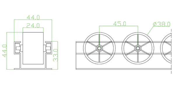 PE 滚轮尺寸 Φ 38mm*24mm 总高(含轮) 43.8mm 每米承载 100kg