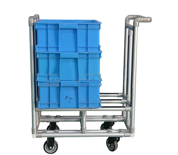 精益管周转车主要由柔性线棒管材、线棒金属接头、层板和脚轮组成。有些企业为了防止产品刮花,还会给线棒管材包上一层EPE珍珠棉或者塑胶。精益管周转车的款式及规格都可根据企业的实际需求设计组装。